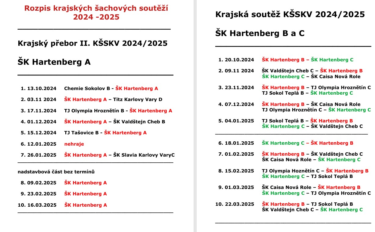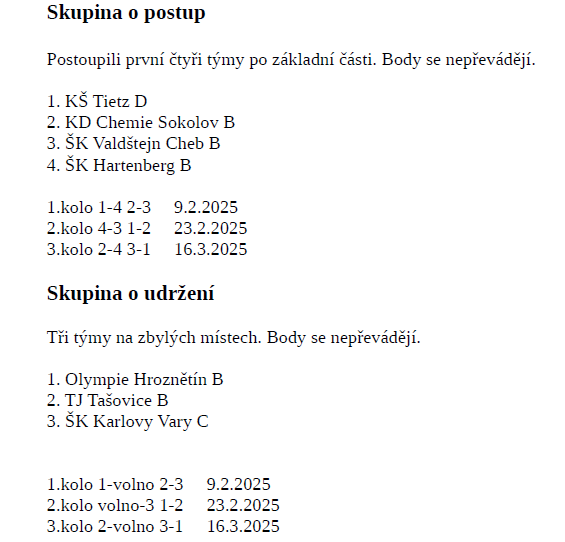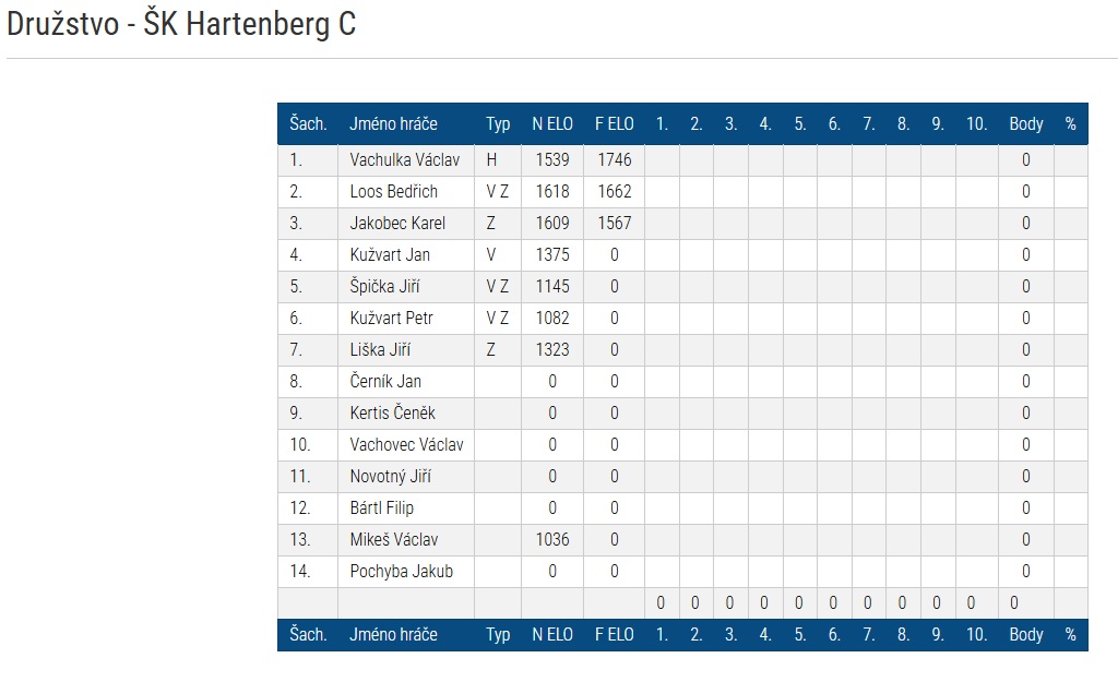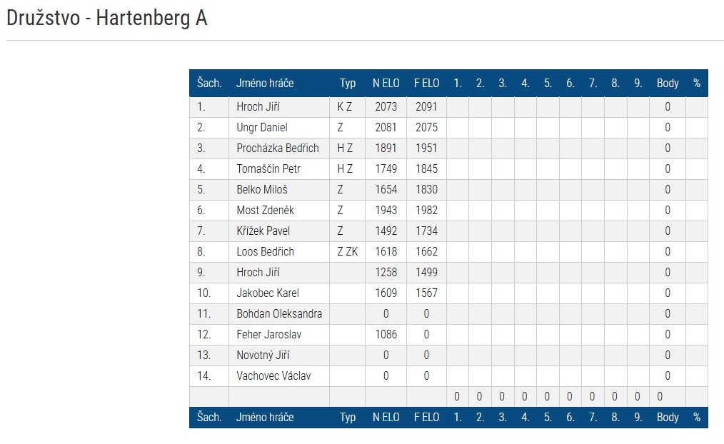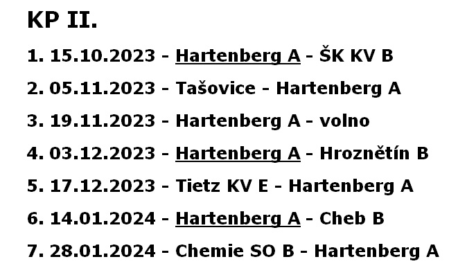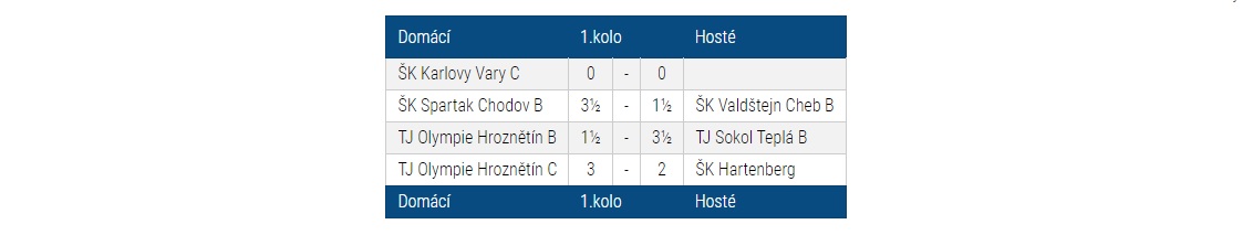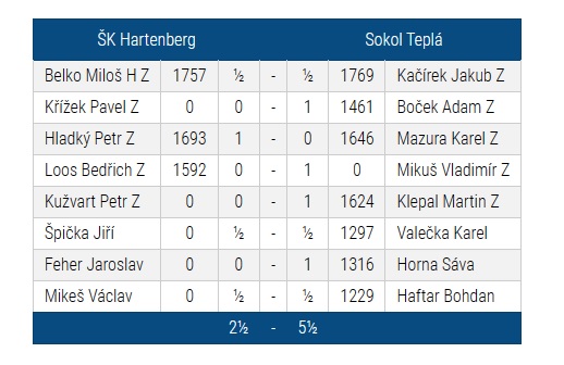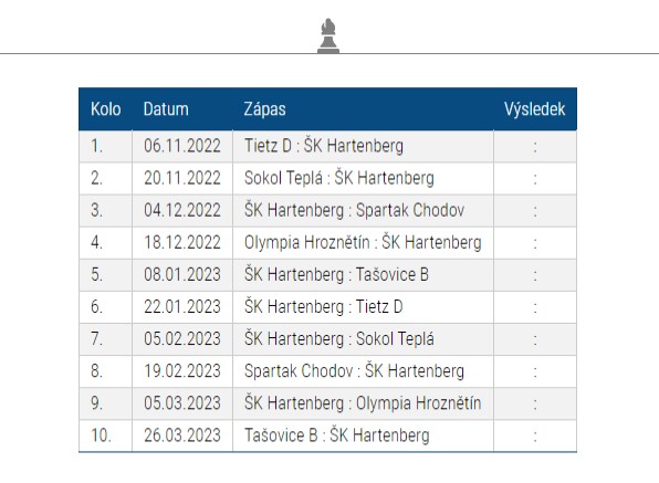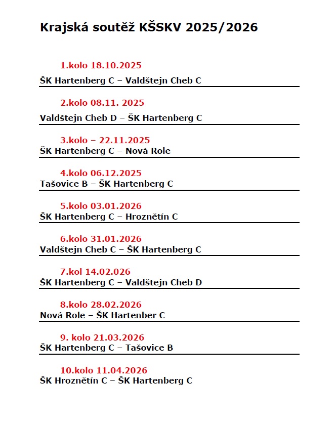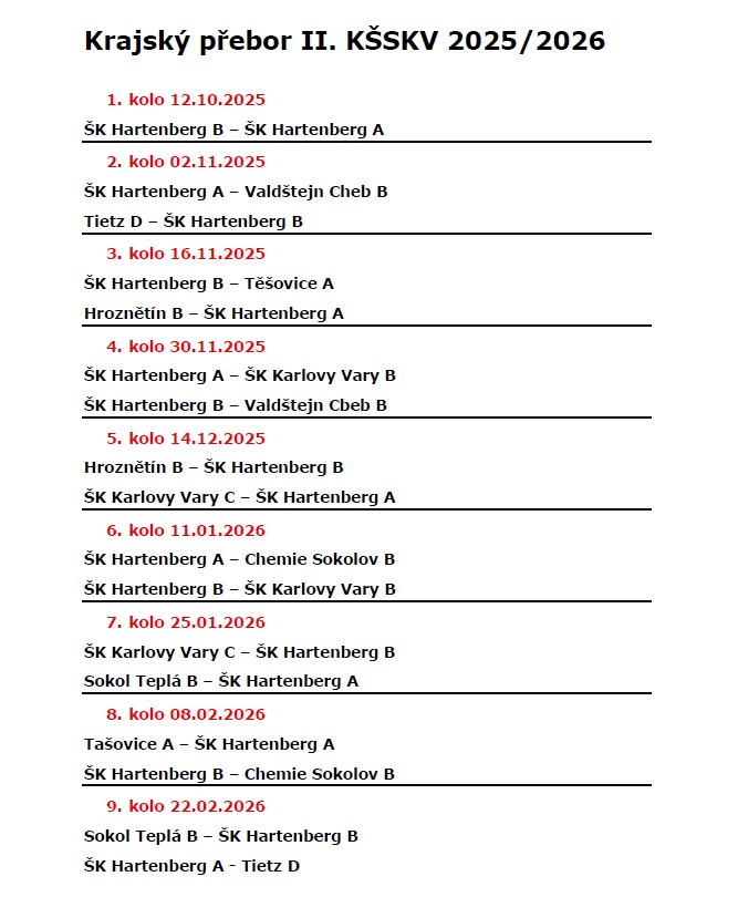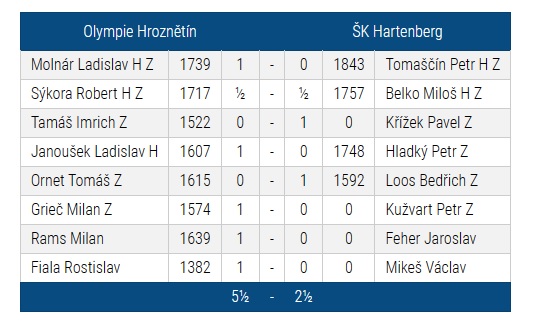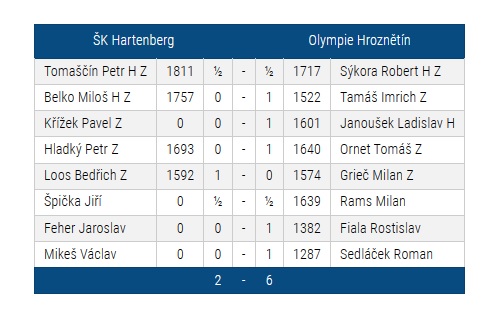 16.11.2025 ŠK Hartenberg B - ŠK Tašovice A 2½ : 5½ Olympie Hroznětín B - ŠK Hartenberg A 3 : 5