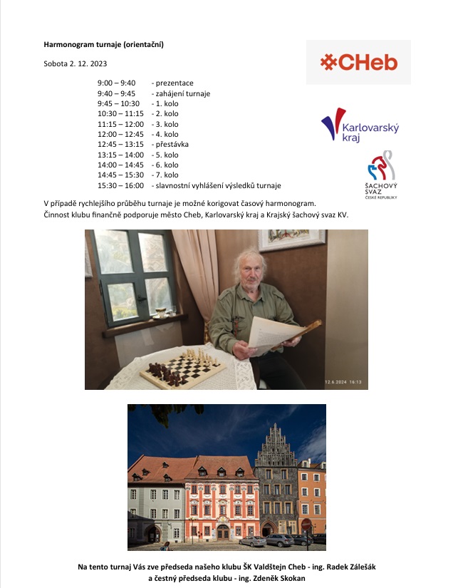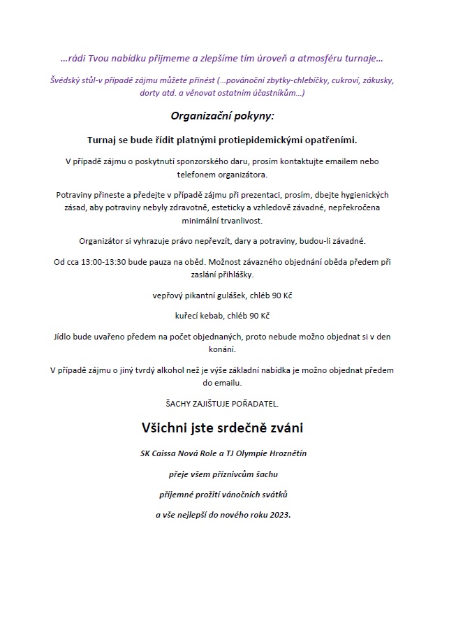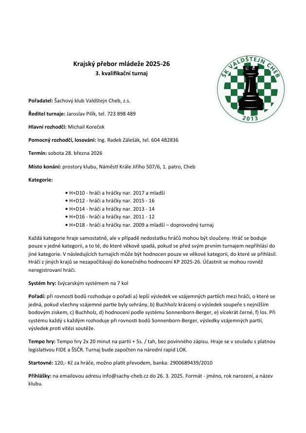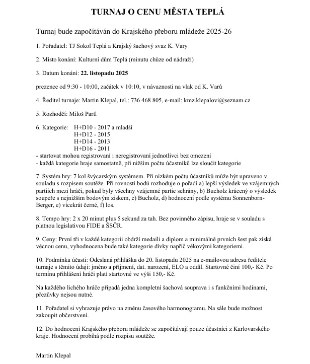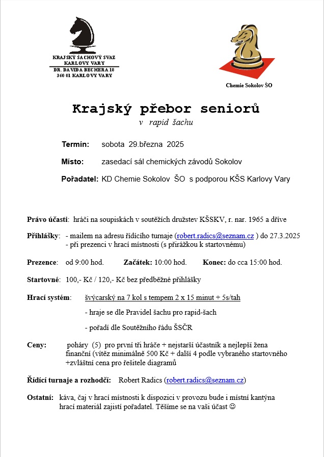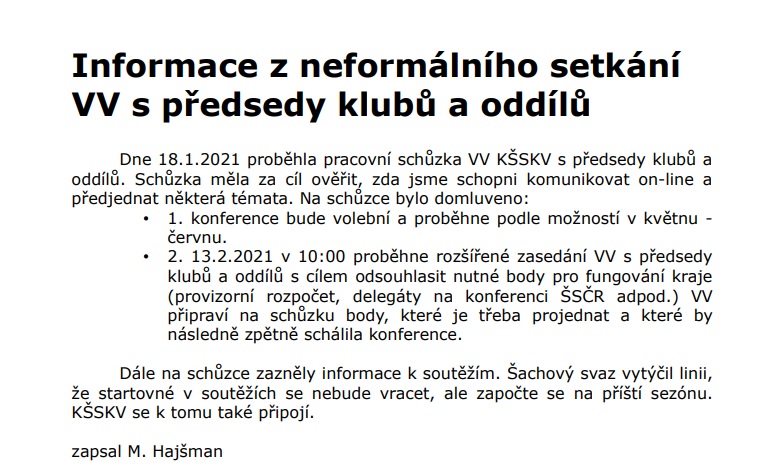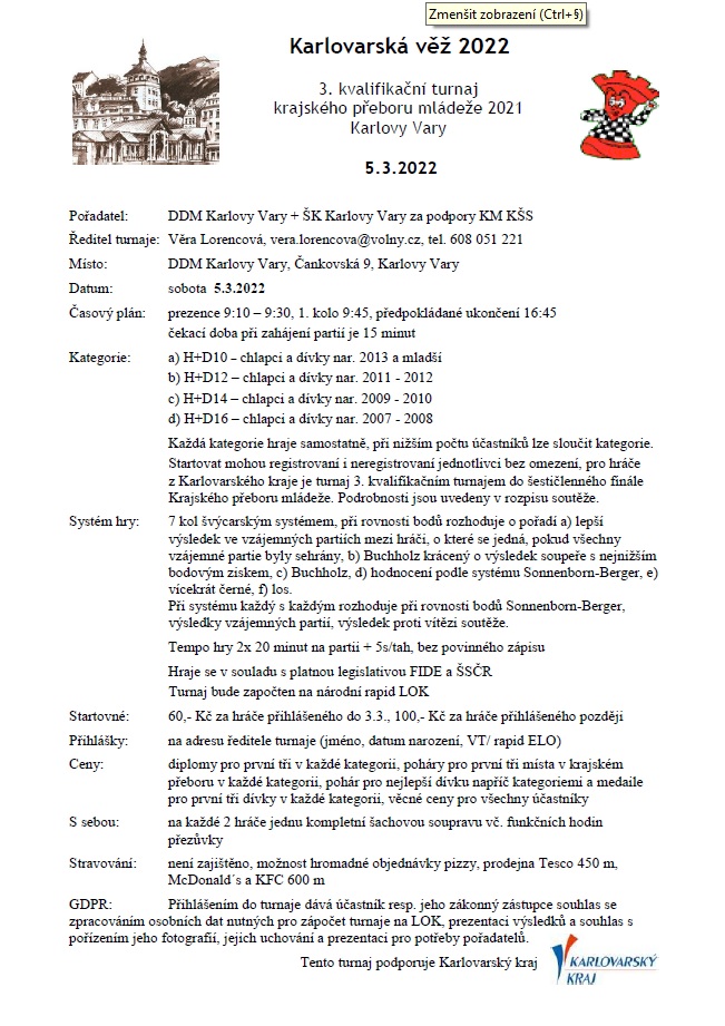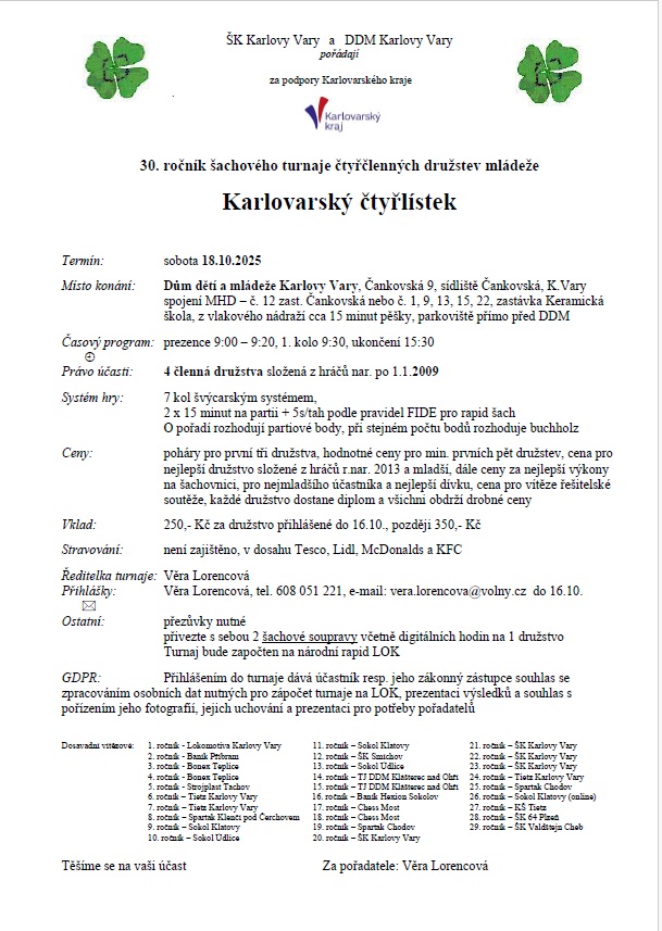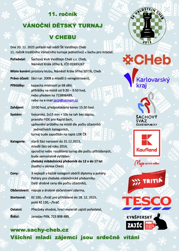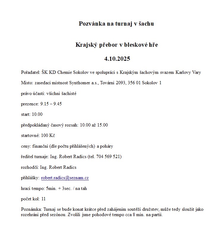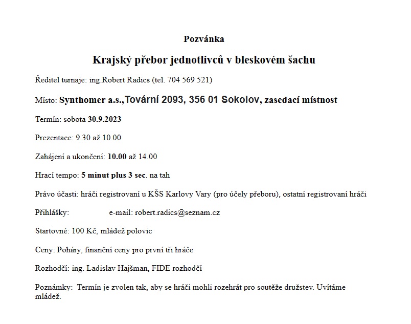 Nabídka pro naše členy - pokud máte v rodině mládežníka a bude schopen hrát šachy online, využijte nabídky. Online přebor mládeže karlovarského kraje nevyžaduje členství v Šachovém svazu ani registraci v oddíle. Jenom čas (vánoční prázdniny) a schopnost hrát šachy přes www.chess.com.