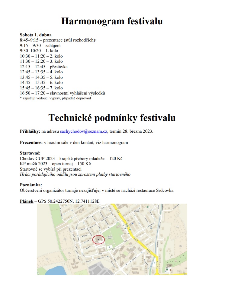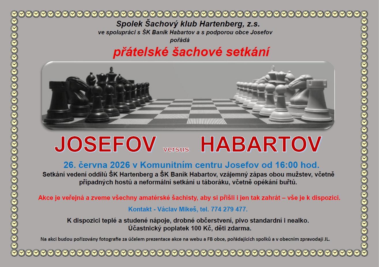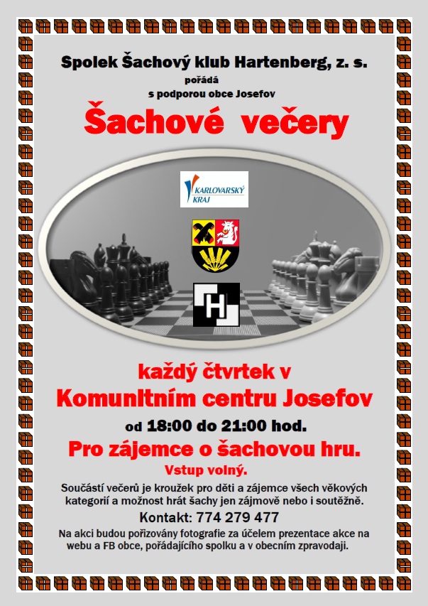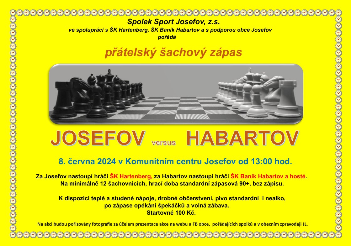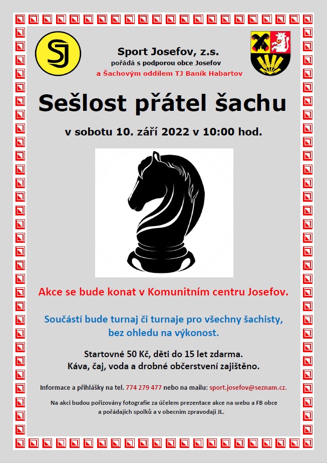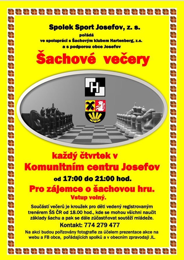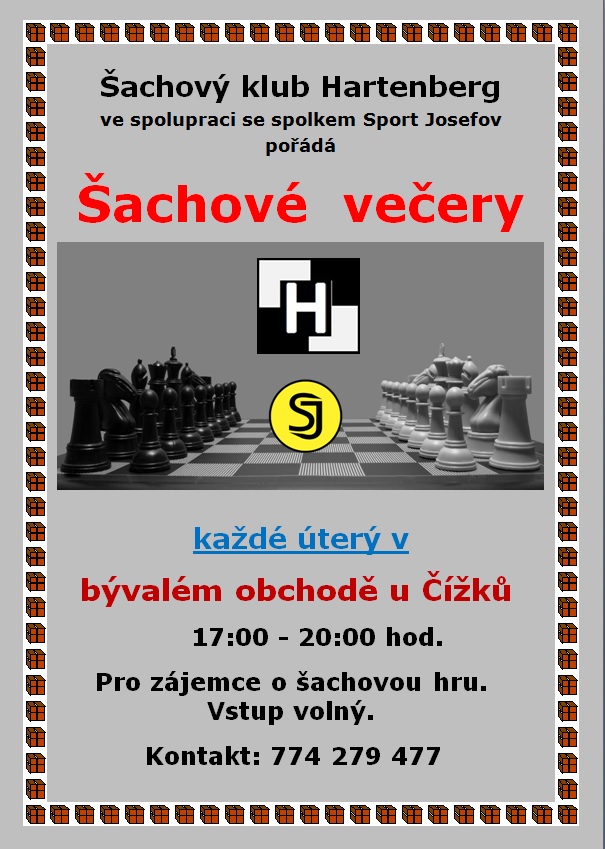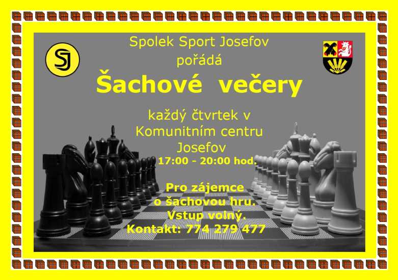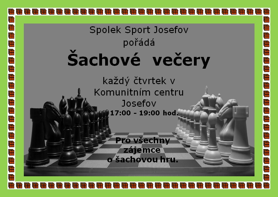 Od 6. října 2022 každý čtvrtek zveme všechny zájemce o šachovou hru do Komunitního centra v Josefově. Přijďte si jen tak zahrát šachy nebo se třeba jen podívat. Uvítáme všechny - od úplných začátečníků (i jenom zájemce o hru) až po zkušené šachisty (mohou se rozehrát před začátkem sezóny).