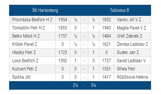 08. 02. 2026 ŠK Tašovice A - ŠK Hartenberg A 2½ : 5½