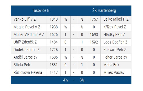 6.12.2025 TJ Tašovice B : ŠK Hartenberg C 2½ : 2½